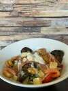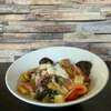 Pomme de terre, oignons rouges, artichaut, poivrons, comté, croutons