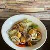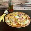 Tomates, viande hachée, poivrons, mozzarella, œuf, sauce barbecue.